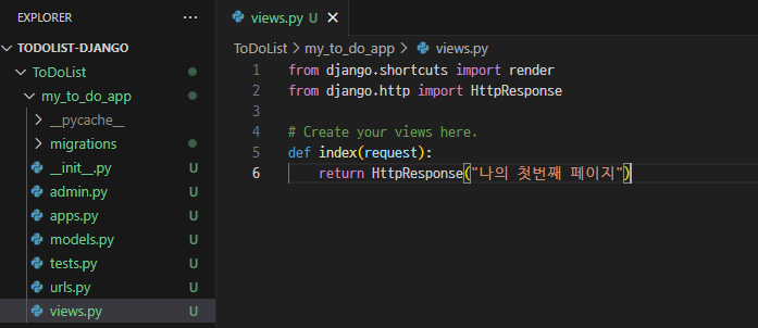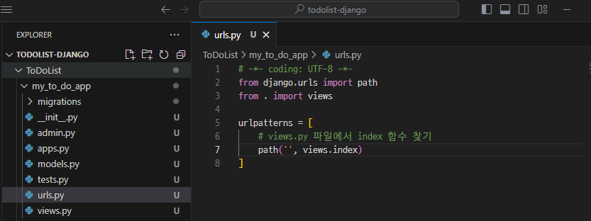 my_to_do_app의 urls.py 에서 views.py를 import하고 urlpatterns 작성