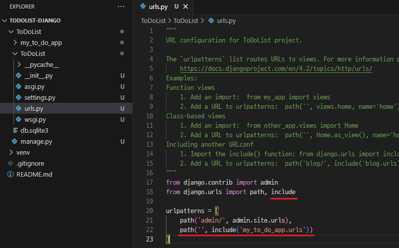 TodoList > ToDoList > urls.py 파일에서 ToDoList > my_to_do_app > urls.py 파일을 사용할 수 있도록 코드 작성해야 함