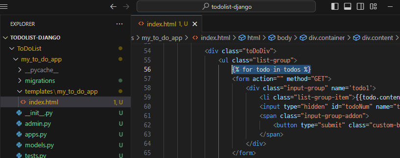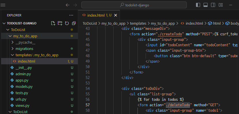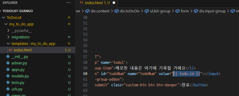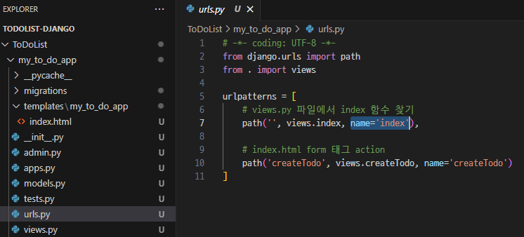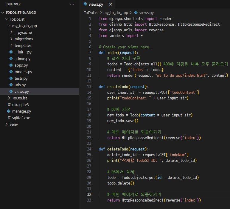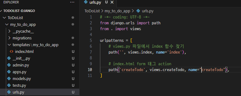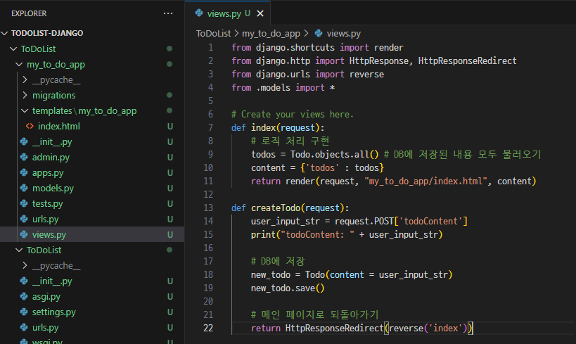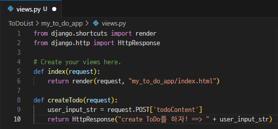 views.py 파일에서 createTodo 함수 (+ 추가)